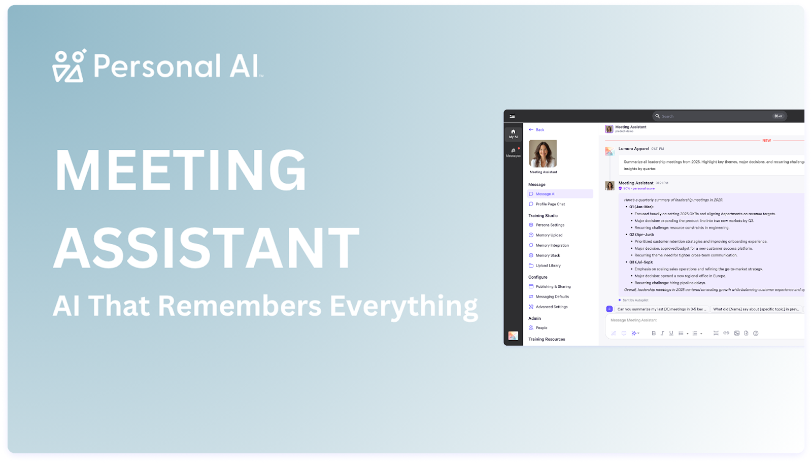 Try it after your next call. Set up a meeting channel, drop in a few conversation prompts, and let Personal AI handle the heavy lifting. Because your meetings shouldn’t just be recorded—they should be transformed into clear, actionable outcomes.