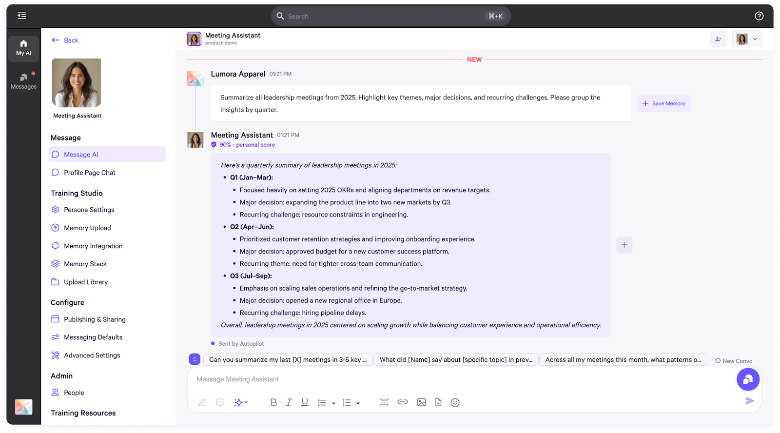 This week we’re spotlighting one of our most popular AI personas: the Meeting Transcript Persona. Meetings drive decisions, spark ideas, and set priorities—but once the call ends, details often slip through the cracks. The Meeting Transcript AI Persona ensures nothing is lost, turning every conversation into clear, searchable knowledge you can tap into anytime.